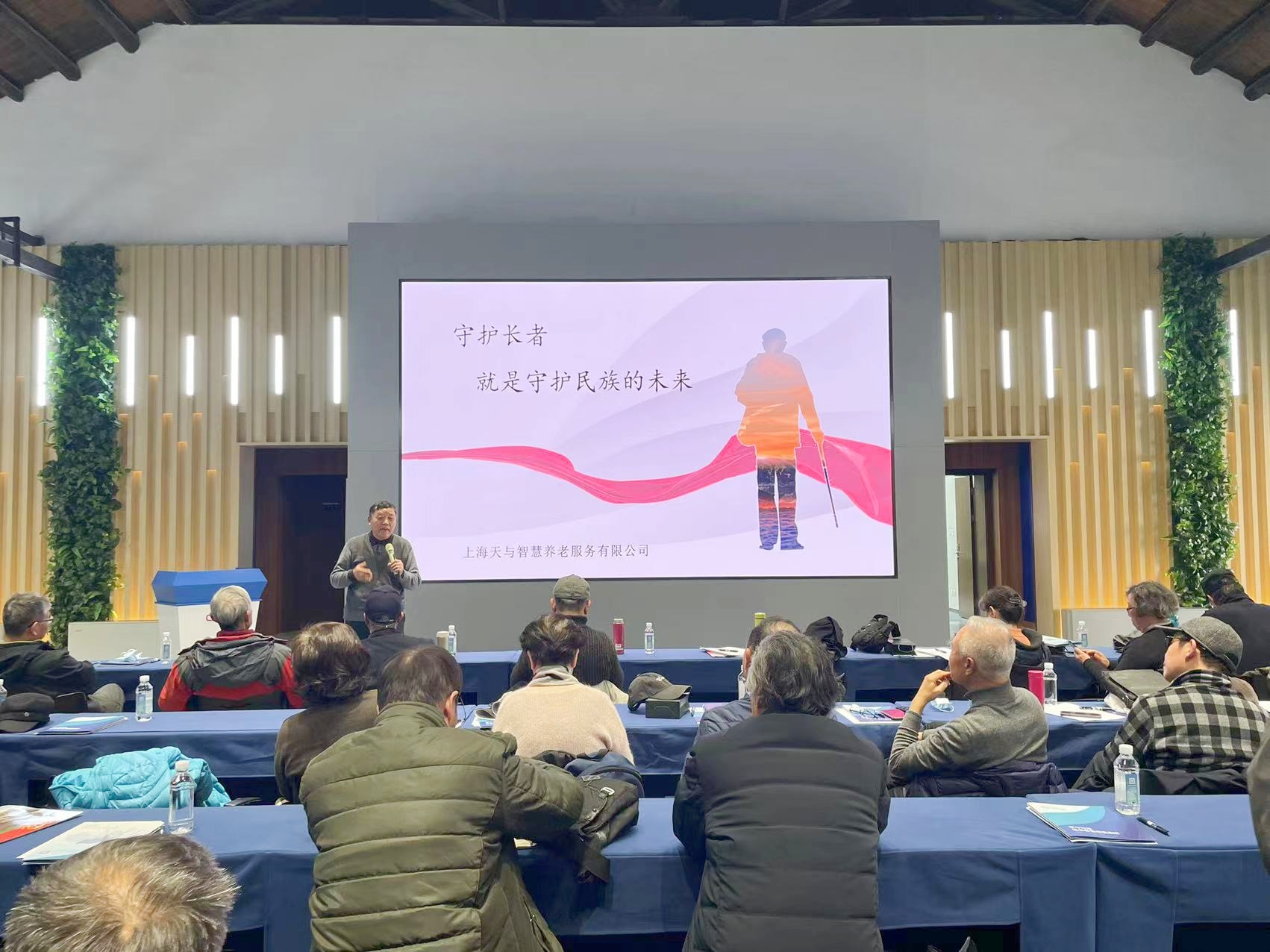 参观结束后,袁江枫以“智享居家,智慧养老”为主题进行汇报交流。他指出:“居家养老仍是中国养老模式主流,但未来居家养老应该更关注老人健康、安全,便利等需求。”作为一家养老科技公司,天与始终致力于中国养老数字基建,着力于养老行业的数字化升级改造,针对老龄化全进程,提供全球合作及自主研发的智能化养老解决方案,服务长者“安全”“健康”“陪伴”“照护”等生活全场景。